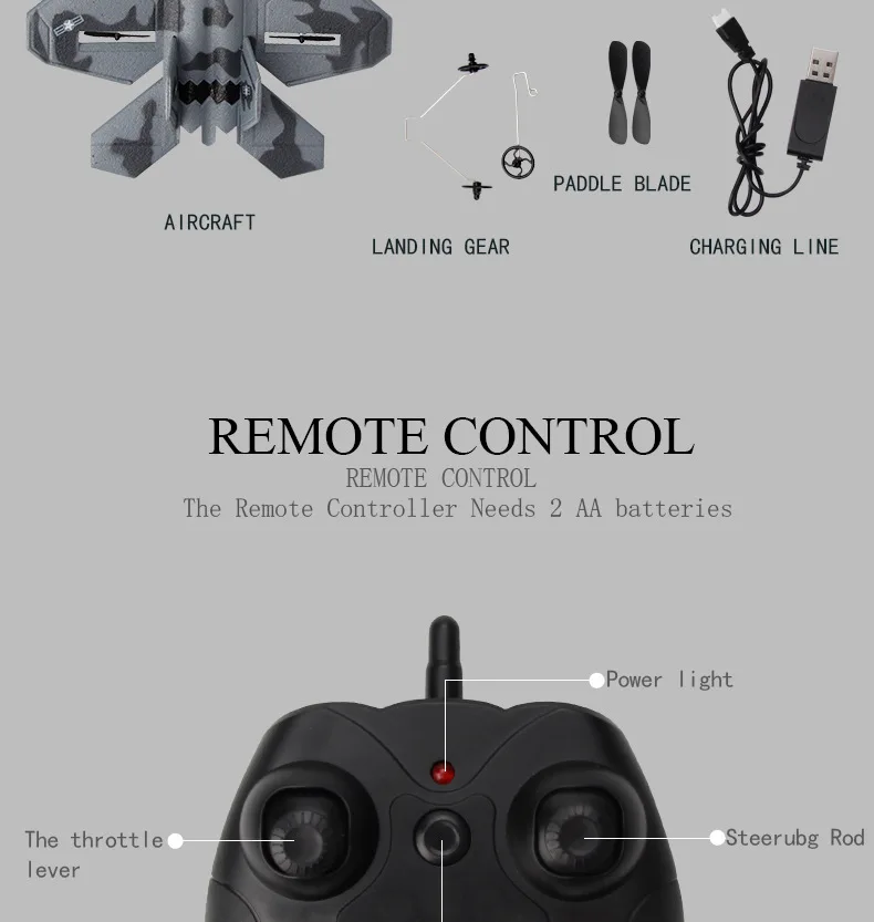 1. According to the same scale reduction of F22 fighter jets, high image fidelity, two-channel design, motor differential and two steering gears control the aircraft to turn left and right, and control the throttle of the aircraft with the left hand;